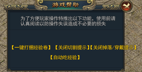 切割提示、穿戴提示、掉落提示这三个功能可在背包里的功能按钮里打开和关闭